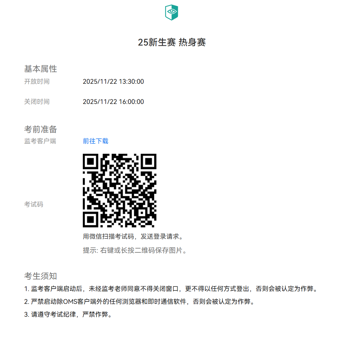3、 本次比赛按照惯例使用OMS系统实行线上+线下监考和反作弊,须自行准备考试需要的机器和环境。请提前安装OMS系统,请按照《OMS用户自测流程》完成本地考试条件测试,可参考教学视频《如何搞定OMS监考系统》 以及补充视频《OMS踩坑排雷攻略》。