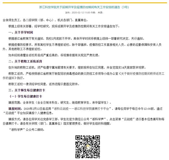 关于延期开学及疫情防控期间有关工作安排的通告。吕兵兵老师特别提出,要重视在云战役上的每日健康打卡,主动在规定时间完成,并且遵守学校相关规定,不能提前返杭。虽然目前疫情的形式有所好转,但是我们不能有丝毫的松懈,一定要众志成城、共克时艰。