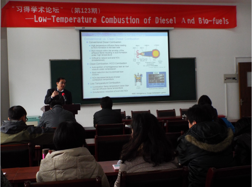 等部门负责人,与李教授进行了亲切会谈。随后,李教授做客习得论坛,作了题为“Low-Temperature Combustionof Diesel and Bio-fuels in Diesel Engines”专题学术报告,报告会由林江院长主持,机械学院及本学院近70名师生聆听了报告。
