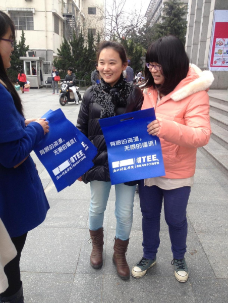 在超市门口发放环保袋活动中,秘书组成员积极宣传,过往的市民也表现出了他们对环保活动的热情配合,争相领取环保袋。一位领着孩子的妇女从我们的志愿者那里领取过环保袋后,他的孩子说到:“妈妈,我也要!”,让志愿者们看到了活动的意义所在:孩子,是教育的首要对象,他们有了环保意识,未来的环境改善才有希望。