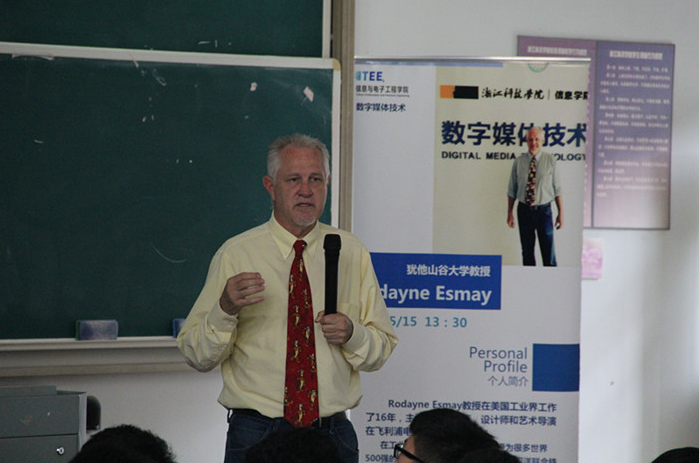 2014年与UVU的交换生项目及其培养计划。最后,Esmay教授为我们展示了他们学校学生的许多动画、游戏的作品,在场的学生无不侧耳倾听,记下了教授宝贵的经验之言。