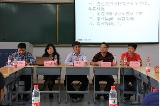 的概况做了说明。副院长叶绿则详细地向各位新生家长讲解了学院的教学工作。在自由提问环节中,家长们就其较为关心的事项向院领导提问,例如新校区里学生的生活条件和学习环境,日后就业前途以及关于出国、实习等一系列问题,院领导一一耐心做出了解答。在座谈会最后,院长岑岗对本次座谈会进行总结时指出,导师制的施行,将会使学校的教学水平有一个新的突破,他由衷地表达了学院对2014级新生到来的欢迎,希望14级的新生们能够尽快地适应大学的学习和生活。