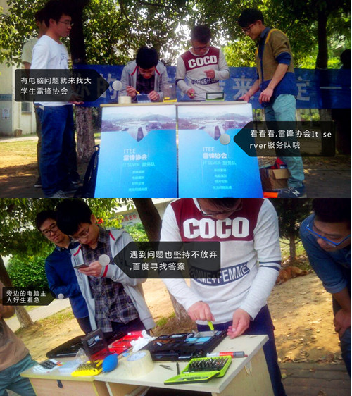 呀呀呀!大学生雷锋协会又来了呢!好多朋友都在跟雷锋协会的成员咨询可以清灰吗?可以装系统吗?可以修理蓝屏黑幕装软件吗?当然可以啦~大学生雷锋协会每月都有现场维修活动,并且活动前期都会发送传单,还会悬挂横幅哦~