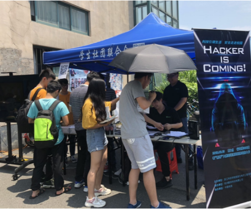 学生会学生干部在浙科院学生餐厅门口搭建起展台,以工具展示、视频播放和有奖问答为主要形式,为同学们普及网络安全知识。下课铃声一响,同学们来到展台向现场工作人员询问并积极参与问答,更有些同学在一起展开了热烈的讨论。默安科技的工作人员认真地为同学们讲解展台上各类工具的原理和存在的安全隐患,引导观看视频,并解释互动问答中的问题和原因,帮助大家更好理解生活中常见的网络安全威胁。