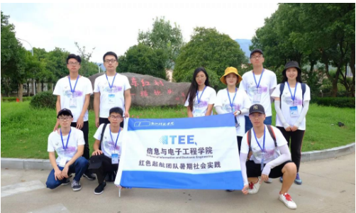 红色起航实践团队在校门口校训碑石前集合就绪,准备踏上暑期社会实践的征途。