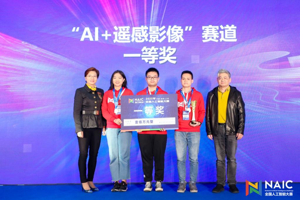 2020届软件工程专业校友陈喆(目前南京大学计算机科学与技术系研一在读)负责的“Amadeus”团队以领先优势夺得AI+遥感影像赛道的冠军,获得100万人民币的奖金。中国工程院院士于全和星河控股集团副董事长姚惠琼为冠军团队颁奖。